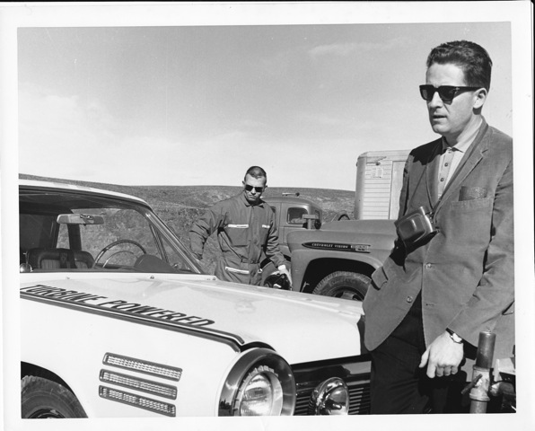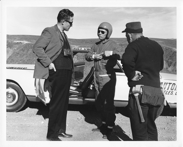 Below are two photos Diane, Jack's daughter allowed me to share here. Jack is the "suit" with the camera around his neck. These photos were taken on location during the filming of the movie "The Lively Set." In the second photo, George Stecher is shown with the crash helmet while the other guy with his back to the camera is probably a Grip. |