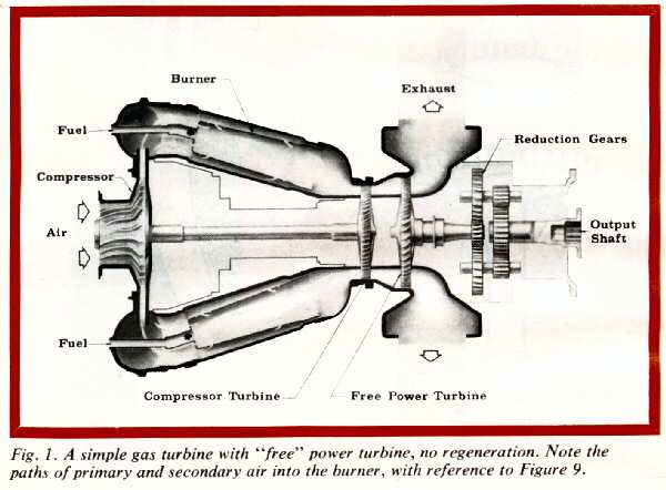 The Greatest attraction of the gas turbine, and that from which all its peripheral attractions derive, is its utter simplicity and directness in getting power from burning gas. Consider, for contrast, the internal-combustion piston engine: pistons stopping and starting, spark plugs firing, valves opening and closing, camshafts camming, breaker points breaking, connecting rods rocking back and forth on piston pins, perhaps even fuel injection squirting intermittently. It's the eighth wonder of the world that all this can go on 60-70 times per second in your personal car as you cruise on the freeway without disturbing your listening to the stereo. But it does, and that's testimony to the efficacy of year-in year-out development of the details.