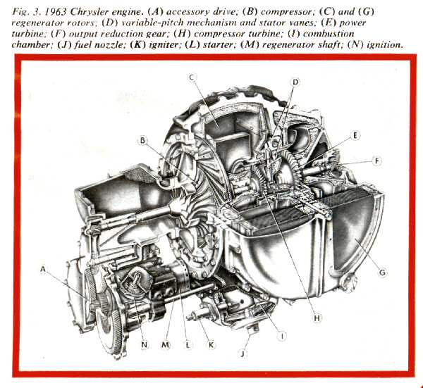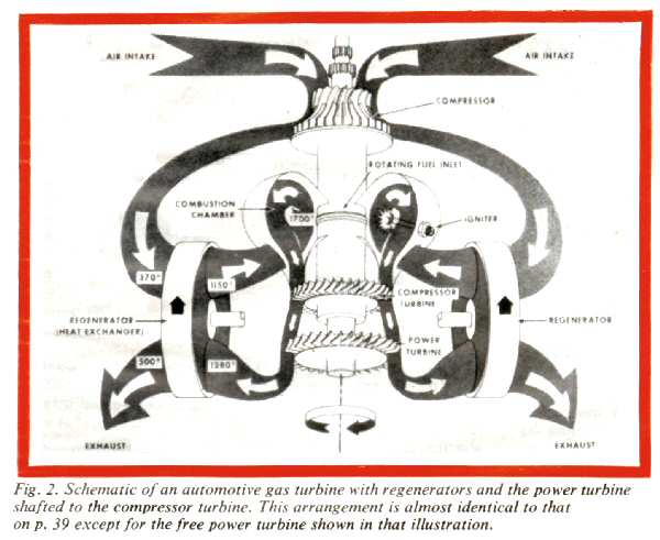 I mentioned earlier that a gas turbine is essentially a constant-speed unit that is happiest and most efficient when it's running at full speed and load. I also mentioned some of the work that has been done on it to make it conform better to our seasoned automotive requirements of start stop, speed-up, slowdown driving, such as the variable pitch power turbine vanes. Another aspect of the turbine's constant-speed nature is that it is slow to respond to an operator's demand for a change of speed: this is the well known "turbine lag," and again in airplanes (or to a lesser extent, trucks primarily for Interstate highways) this is not important. But in a car it is-at least we've come to expect the instant response of the piston engine to a push on the accelerator. In Chrysler's first turbine engine it took a full 7 seconds after the go-pedal was depressed for the engine to develop its full torque output! But steady development, and particularly the addition of the variable vanes, has brought this down to less than 1.5 sec and perhaps drivers could adapt their driving habits to compensate for this lag.