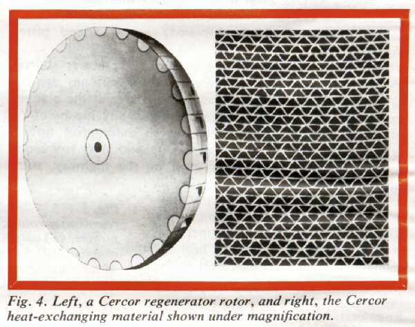 Refer again to Fig. 2, the Williams turbine, an 80-bhp unit that will be installed in an American Motors Hornet for testing in New York City. Here we have what is now a common configuration of regenerator: two large discs of Cercor, a ceramic-glass material developed by Corning Glass Works for the purpose, rotating at a speed determined by gearing from the compressor shaft. In the case of the Chrysler turbine of Fig. 3, which has the same type regenerator discs, the gearing is on the order of 2100:1 so that a maximum compressor speed the regenerator is doing only 22 rpm! Fig. 4 is a photograph of a regenerator rotor, and the right portion shows the porosity of Cercor under magnification. Porosity aids the heat transfer.