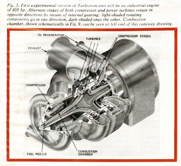 The Compressors of all the gas turbines shown so far are radial or centrifugal: that is, the incoming air is flung outward from the centerline of the compressor for its compression. We can have axial compressors too, in which the path of the air being compressed is parallel to the shaft. And one compressor is not the limit by any means: there can be several stages, depending upon the power output desired and the complexity allowed by cost limits. The Pratt & Whitney ST6 unit, as used in the original STP turbine car that almost won Indianapolis, has a 4-stage compressor with three axial and one radial stages. Another form of compressor, relatively rare, is the centripetal: this is shown in Fig. 5, a cutaway of a new turbine being developed by a company called Turbotron. Many other variations in configuration are possible; the first regenerative Chrysler turbine had a single, extremely thick disc atop the engine instead of two at the sides, for instance.
