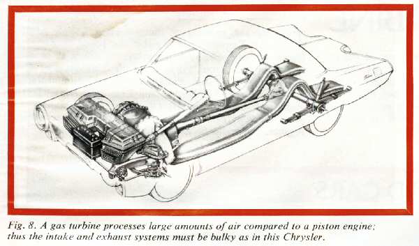 The gas turbine engine is, in the words of one turbine expert, an "outsized air compressor." It ingests a terrific amount of air compared to that the piston engine takes in, especially at idle; and handling all this air at idle takes a large amount of power. This is a prime reason for its poor economy when idling. Proponents of the turbine have noted, especially in connection with the air-intake restrictions that effectively took the turbine out of the running at Indianapolis a few years ago, that if one includes the cooling airflow of a conventional engine that is the air processed by the engine fan either over cooling fins or through a radiator, its air consumption is quite similar to that of a turbine of comparable output. They also claim that the excess air handled by the turbine is just that, excess and that it emerges from the engine as oxygen. One well-known turbine man, George Huebner of Chrysler, even says that the unburned hydrocarbons in polluted air ingested can be burned in the turbine! In any case, the old parts-per-million measurements of pollutant concentrations in the exhaust would he quite meaningless for a turbine, and the current methods of measuring ppm and converting to grams/mile must take into account the much greater exhaust volume of the turbine. The quantity of air ingested and exhausted by a turbine is nicely illustrated by Fig. 8.
