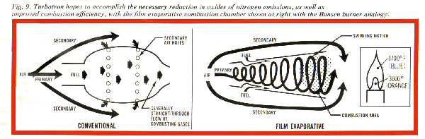 Turbotron's solution is shown in the second half of Fig. 9. Here the primary air enters with great swirling motion imparted by the centripetal compressor into a chamber of increasing diameter. The fuel is introduced peripherally and, Turbotron claims, heated and vaporized by the hot, swirling air. Secondary air is brought in at the far end of the chamber, and the claim here is that the swirling motion induces much improved mixing here; it is in this area that most of the combustion takes place. Turbotron further explains the film-evaporative process by an analogy to the Bunsen burner flame (shown also in Fig. 9) in which there are two visible sections of the flame, the blue (secondary combustion) part at 1700°F and the orange (primary) part at 3600°F. Pavlecka says that most of the combustion in this chamber takes place at the blue, or lower-temperature, level-thus reducing the NO, formation.